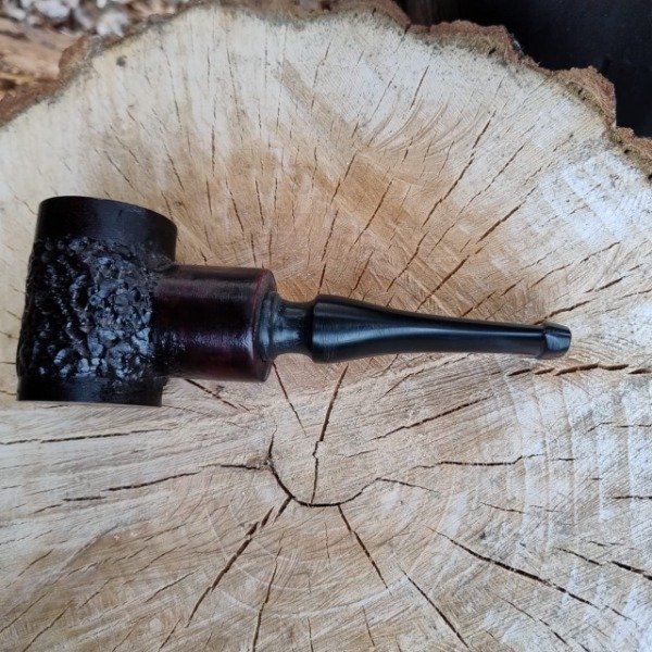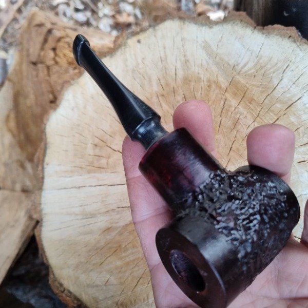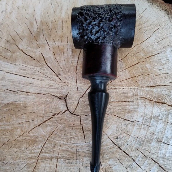 Ejemplar de la familia de las chubby pocket con tonos vino tinto que dan una combinación única dado el dibujo que hace la naturaleza con sus vetas, y la definicion de trazos en su tallado a mano; tiene la particularidad de ser una chubby de boquilla larga llegando a medir toda la pipa 15 cm, siempre respetando el diseño propio que nos caracteriza en este modelo, con su camara de airea que le hace una fumada refrescante, la misma esta confeccionada en acrilico negro, su cazoleta con una altura de 56 mm y un ancho de 442 mm su hornillo de apertura de boca de 19 mm y una profundidad de 30 mm; con un peso de 104 gramos es unas de las demomunadas pipas de mano, para toda la vida.