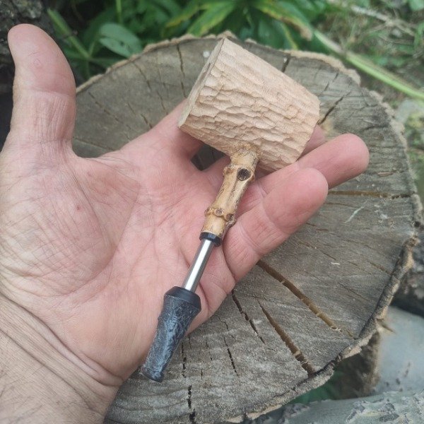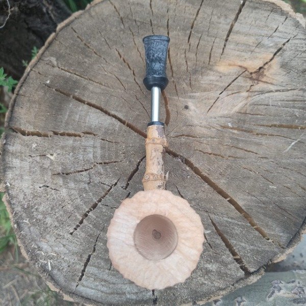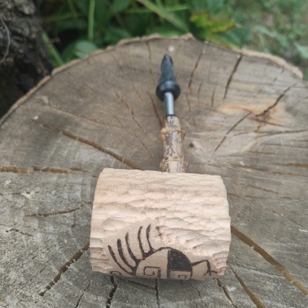 sigiendo con el shape de esta familia origenes, esta pipa esta totalmente tallada a mano, en su color natural de raiz de maiten, grabado a mano de imagen de chewke o ñandu , con inserto en bambu bicolor, anilla en acrilico negro caño en acero quirurgico y boquilla negra totalmente tallada a mano