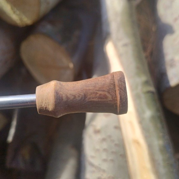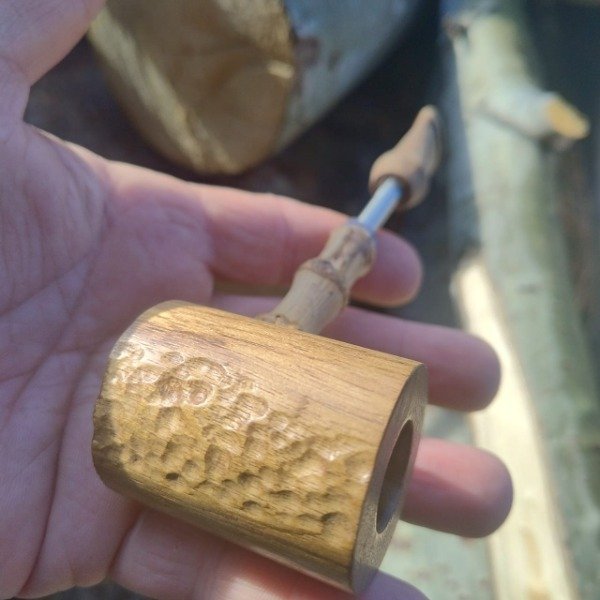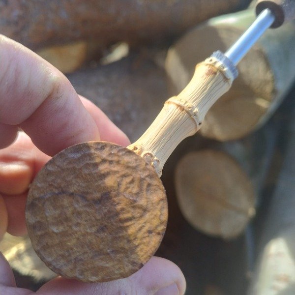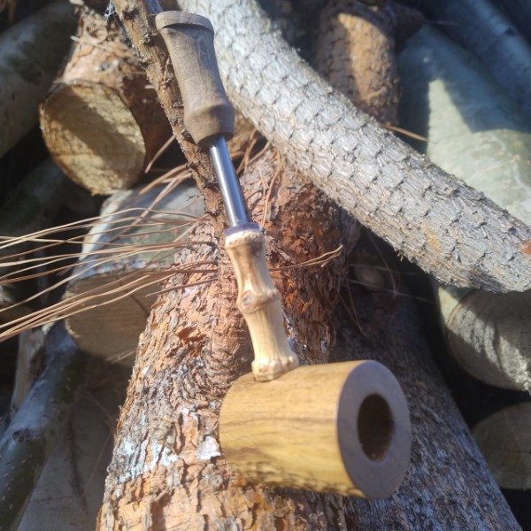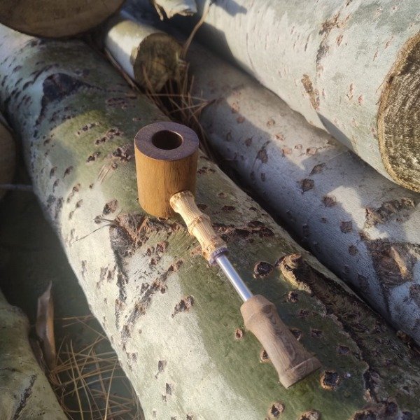 Cazoleta en raiz de laurel patagonicocon un tallado parcial en su cazoleta y en su base, caño en acero quirúrgico de alta calidad que nace en la boquilla y termina en la cazoleta misma con un recubrimiento de bambú y con anilla en acrílico negro y boquilla en raíz de nogal. Peso 53 grs, Largo de la pipa 16,5cm, cazoleta confeccionada con una medida de 4 cm por 4, cm, con una altura de 5 cm, y profundidad del hornillo de 3,7 cm con apertura de su boca de 19,5 mm y teminando e su base en 14 mm, dando una forma conica que permite mayor vida a la cazoleta, dicha confeccion de hornillo es de diseño porpio.