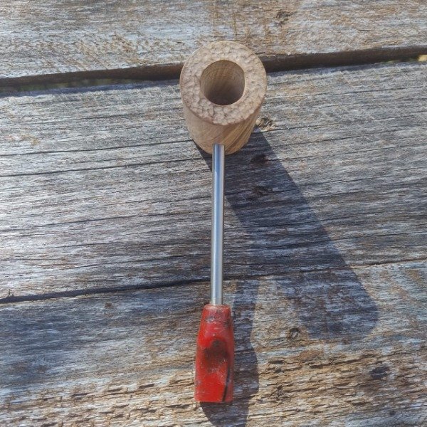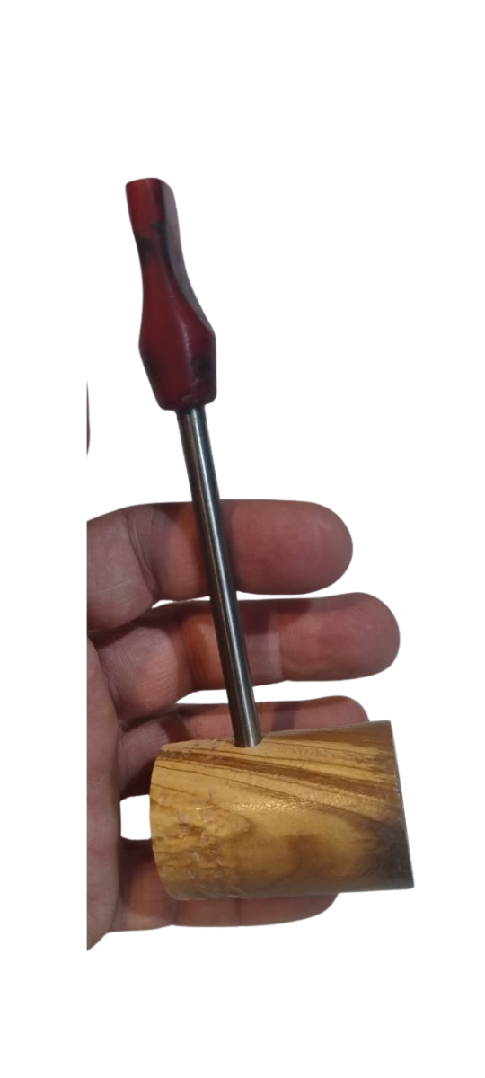 Cazoleta en raiz de olivo, caño en acero quirúrgico y boquilla Drácula en dos tonos, rojo sangre y negro. Peso 61 grs; largo 16,5 cm; cazoleta 5,5 x 3,7 cm; hornillo 1,95 x 1,4 cm; profundidad 3,5 cm