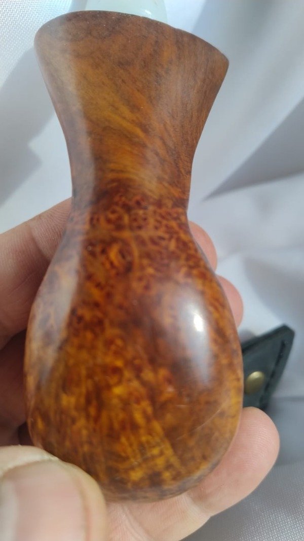 Cazoleta en Llao llao tallada, laqueado y bruñido, boquilla en derlim blanco todo realizado a mano, el diseño es em honor a la casa Japonesa Tsuge del cual soy gran admirador de sus trabajos, Peso:82 grs; largo15 cm; cazoleta de diametro de 45 mm x 53 mm, de un shape muy especial con difrentes relieves un trabajo de tallado sobre reliene entre el caño y la cazoleta donde se busco emular la lava del volcan Sakurajima, la cazoleta confeccionada en bloque de llao llao patagonico de produccion propia, tiene una belleza inigualable entre las maderas nacionales , puesto que en sus diferentes trazas el juego de las vetas forman fijuras muy similar a el ojo d eperdiz del brezo, cariñosamente que he llamado ojo de codorniz. es una pipa para aquellos amantes de ejemplates de diseño de edicion limitada. Su hornillo con una profundidad de 30 mm ; apertura de boca de 18 mm terminando en 15 mm el la base de la misma lo que le permite una mayor durabilidad a la cazoleta por su dieño.