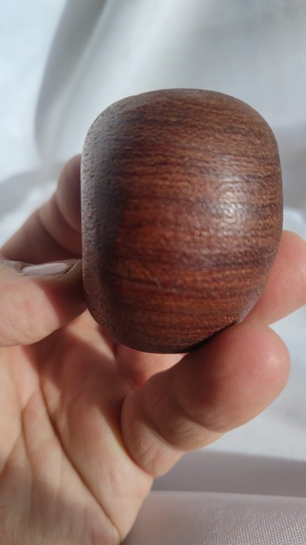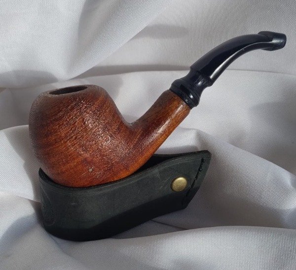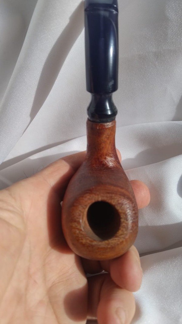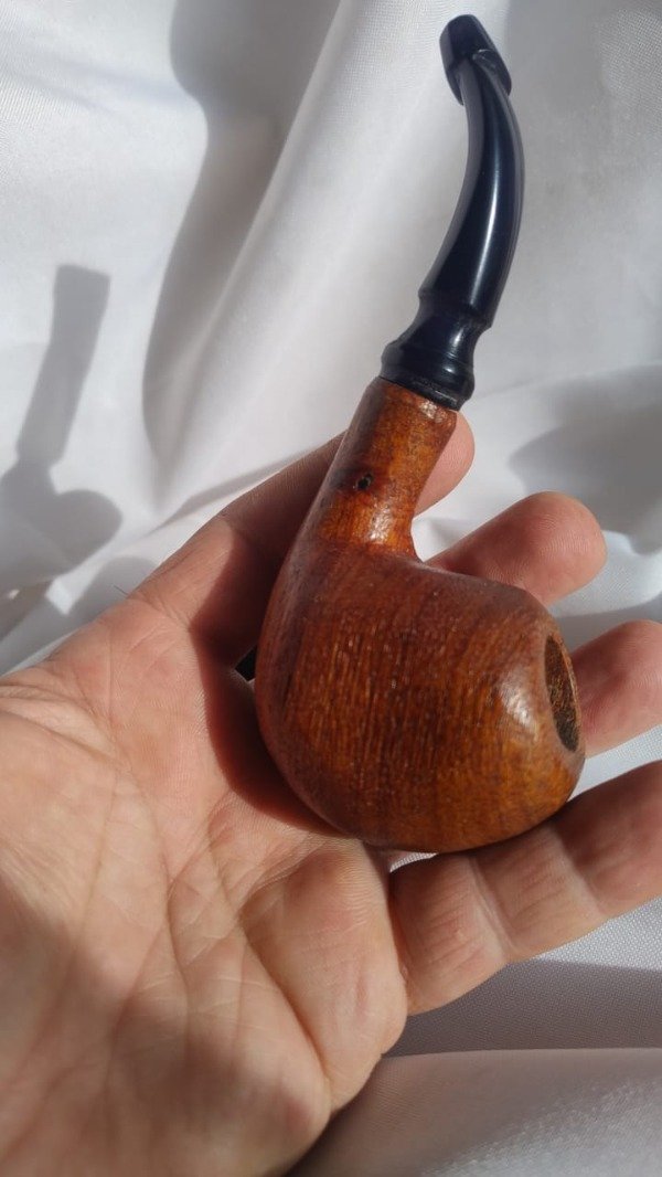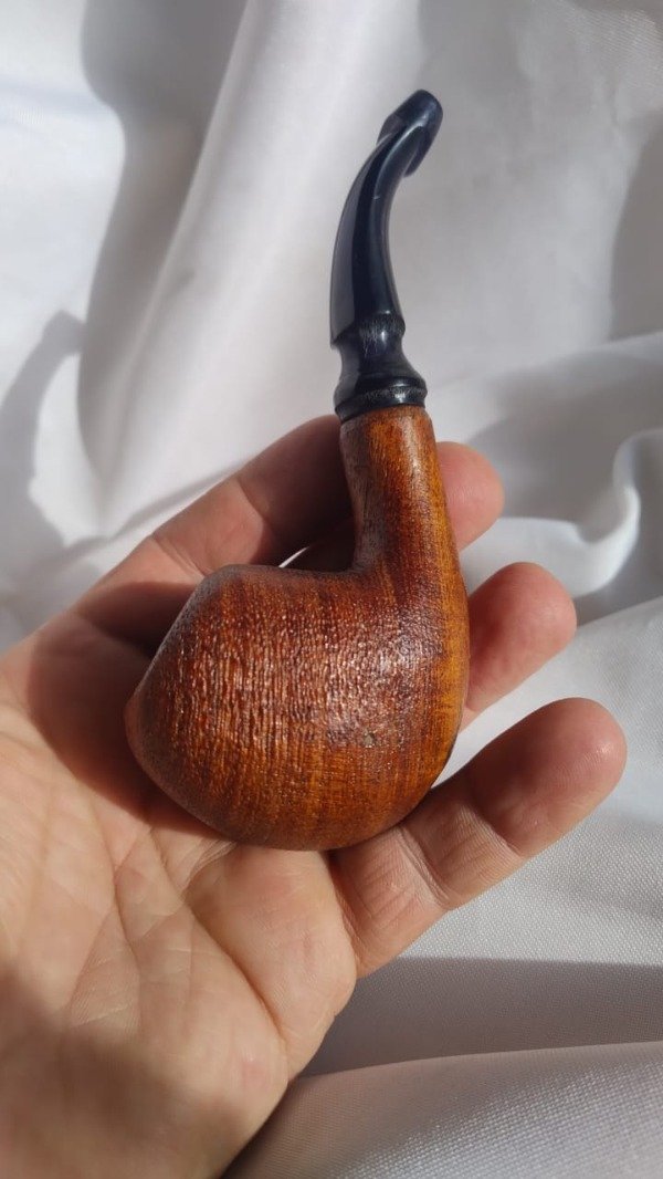 Elaborado en raiz de algarrobo azul, tallado, arenado y laqueado siguiendo el trazo de sus vetas para lograr ese efecto en la cazoleta; con su boquilla en acrilico negro especialmente confeccionado para este ejemplar, Peso: 68 grs:14 cm de largo:cazoleta de 42 mm x 50 mm, una altura de 5,5 cm;hornillo de 19 mm de boca ; profundidad40 mm terminando en 15 mm , conico lo que le permite una mayor vida util a la pipa y muy buen xarga., de diseño propio.