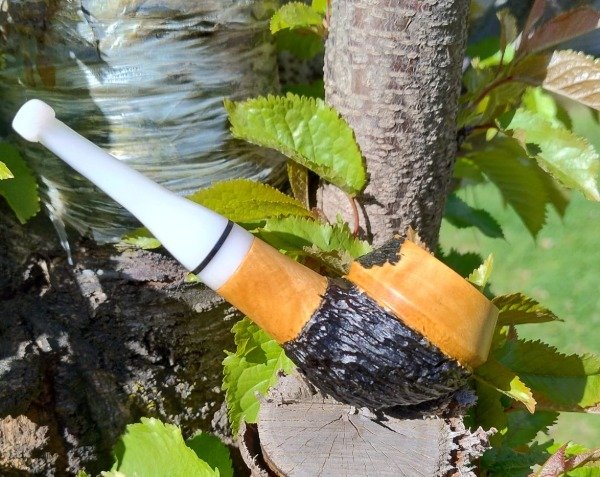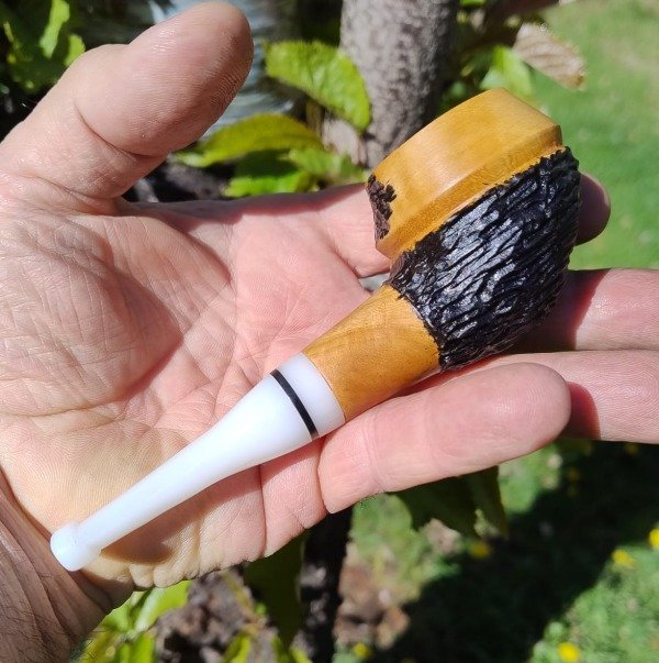 "Pipa artesanal de la familia Dogo/Bull Dog, confeccionada a mano con materiales de primera calidad. Su cazoleta en raíz de olivo, tallada y teñida en negro, ofrece una experiencia de fumado superior. La boquilla de derlim blanco con anillo de acrílico negro completa este ejemplar de diseño clásico y refinado. Un regalo perfecto para conocedores."