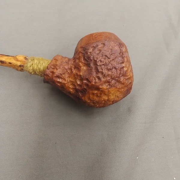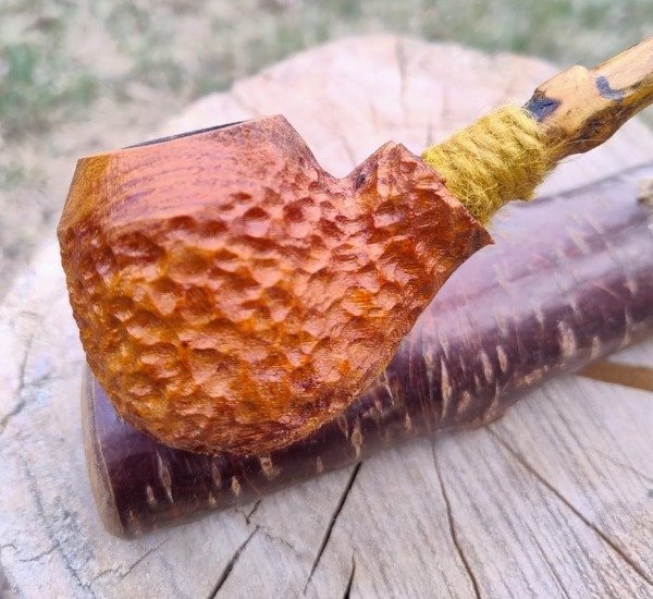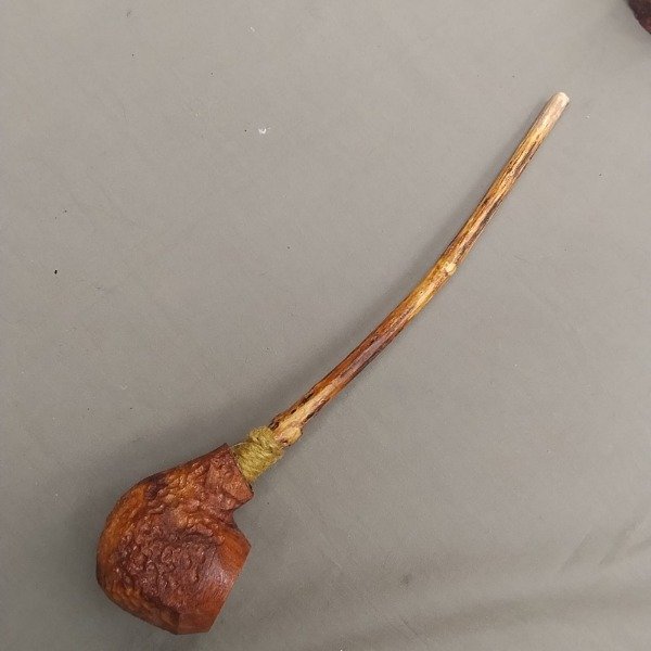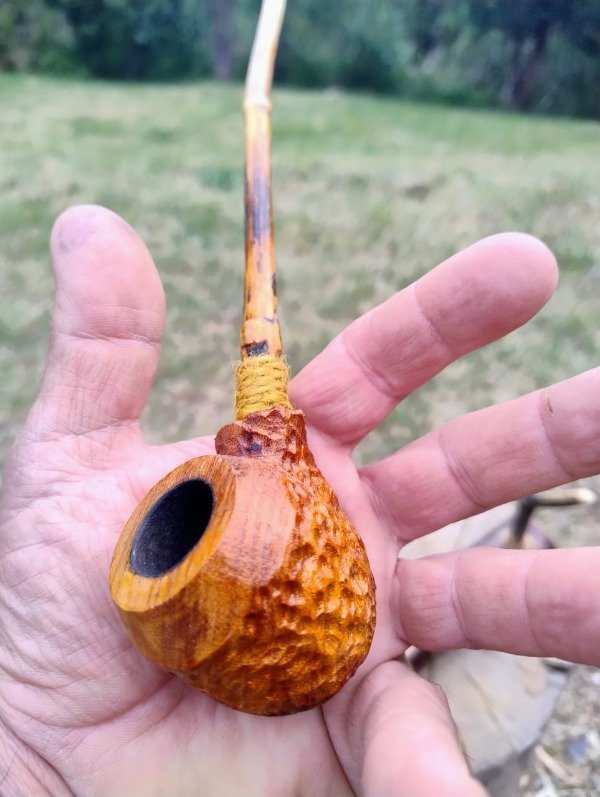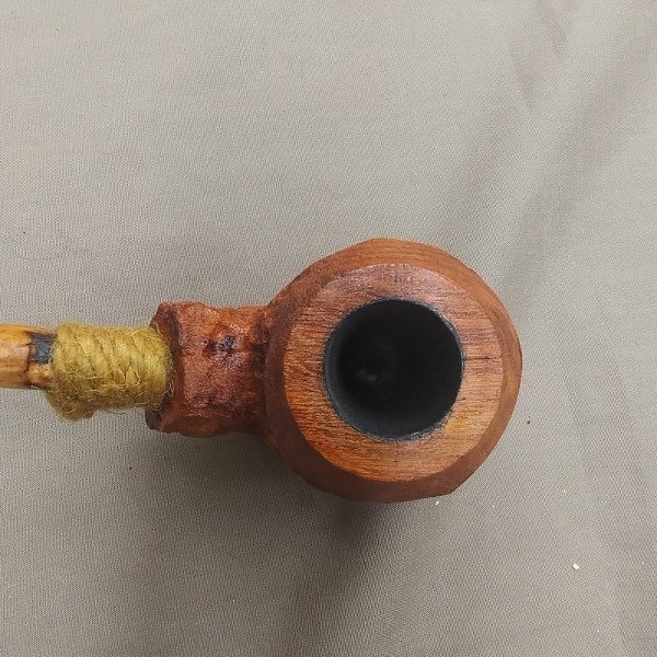 Hermoso ejemplar en cazoleta de olivo tallada, laqueada y rusticada, con boquilla en fresno, realizada conservando las tecnicas celtas, peso 69 grs; levemente curvada; largo:30 cm; ancho:45 mm, altura 52 mm, profundidad 33mm, apertura de boca 19 mm terminando en 16 mm.