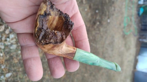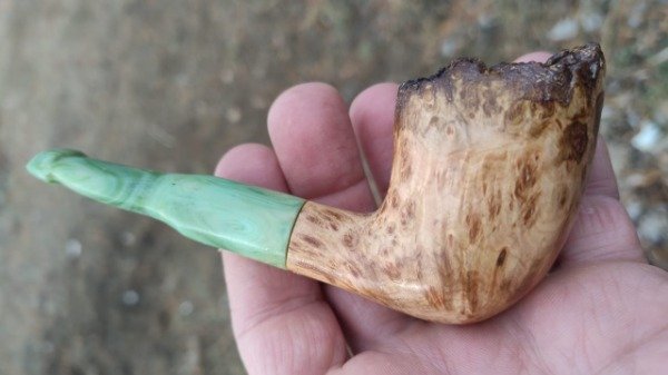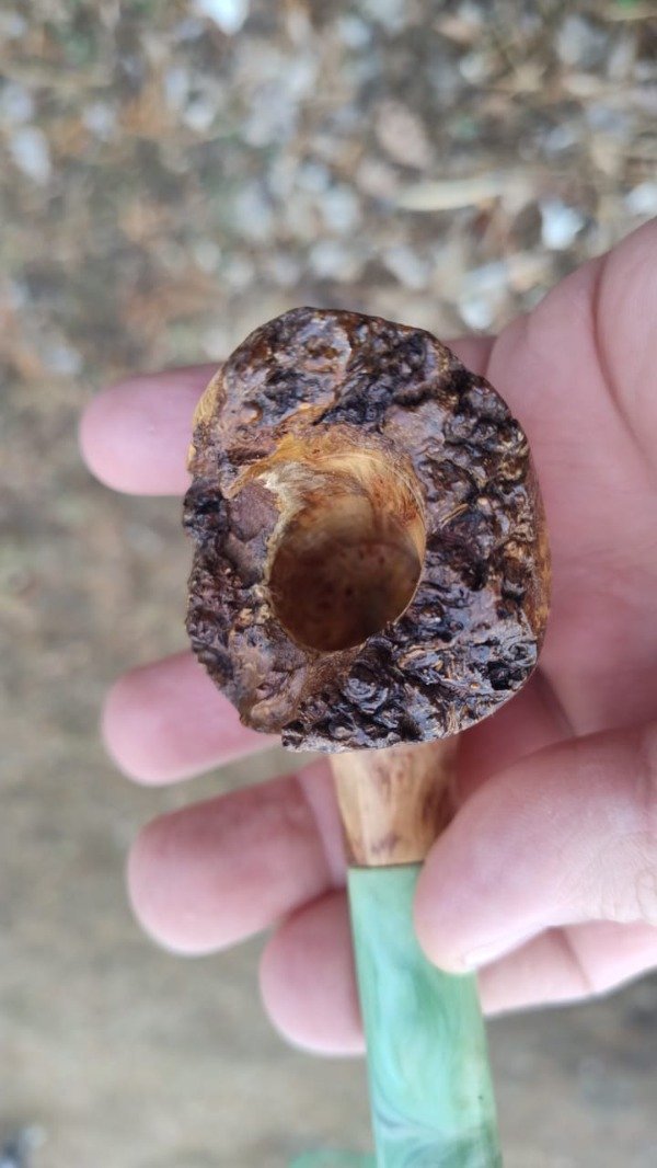 Unico en su tipo por las caracteristicas de su confeccion y materiales, siendo la belleza del llao llao que resalta en sus ojos de perdiz, con un shape muy especial, especialmete con el diseño por la apertura de l acazsoleta que esta diseñada para proteger del viento he de aqui su nombre, un largo total de 14 cm, con ujn peso de 63 grs, su cazoleta con un ancho de 46 mm por un alto de 67 en la parte mas alta mm; hornillo con una profundidad de 30 mm en la parte mas baja, apertura en boca de 20 mm ,su boquilla realizasa especialmente para este modelo con un degrade en tonos pasteles verde y celeste, siendo los tonos verde los que mas resaltan